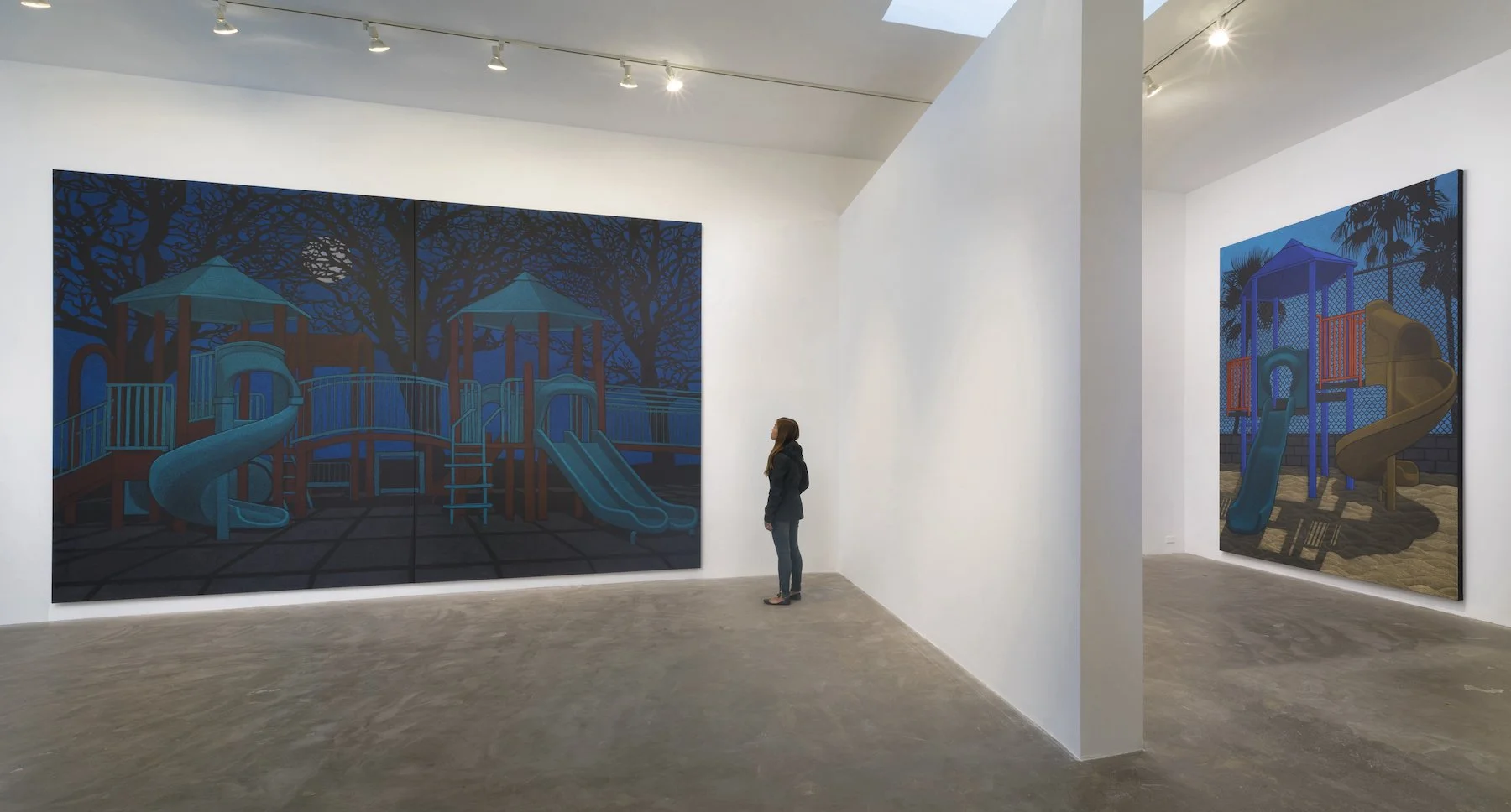 [Image description: A white-walled gallery interior is bisected by a perpendicular wall. On the left side of the wall, a woman stands next to a monumental picture of a playground at night. The play structure, drawn in turquoise and rust, is set against a background of leafless trees and a full moon. On the right side of the wall is another large-scale image of a children's play structure, in royal blue, orange, turquoise, and beige. The scene is bright with a chain link fence and palm trees in the background.]